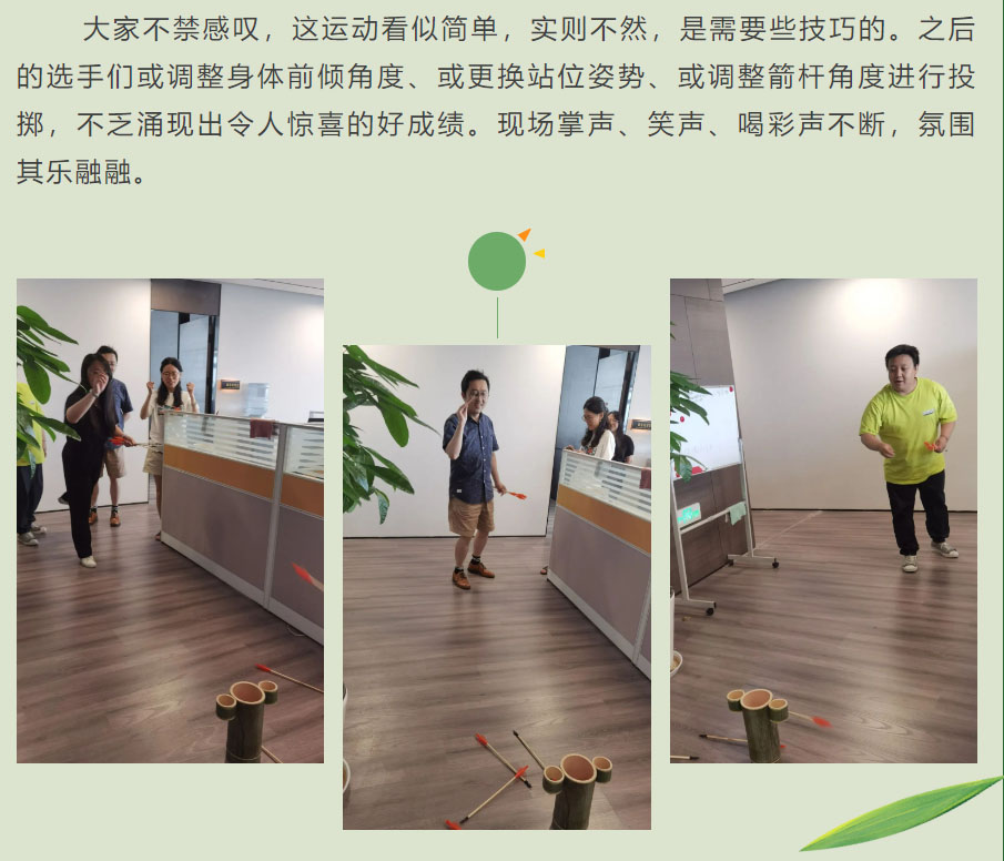 为弘扬和传承中华民族的传统文化,公司工会于 6月20日下午组织全体职工开展了一场“趣味投壶”比赛,一起体会古人的风雅生活。 投壶即“投箭入壶”,是古时由射礼演变而成的一种投掷游戏。